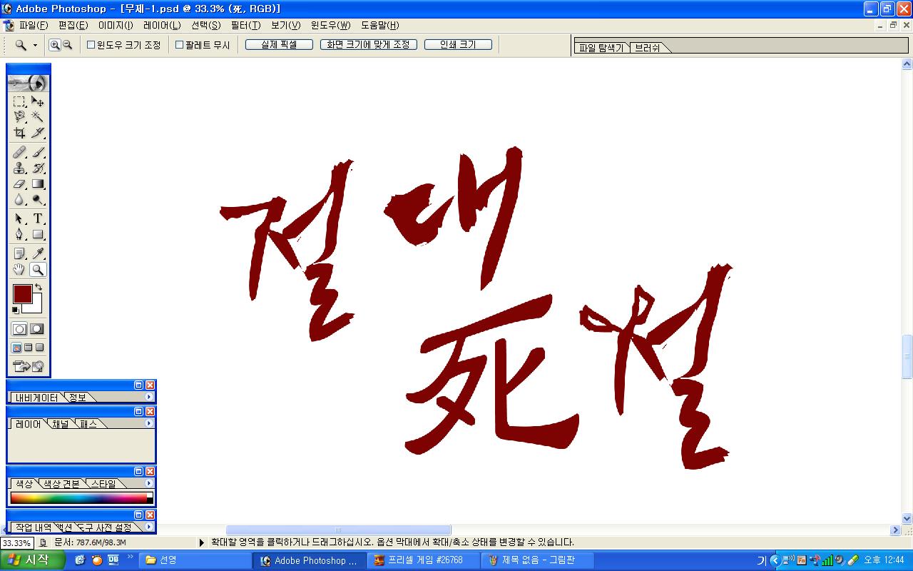 정중히 캘리 부탁드립니다. -_- 류재철 일반 0 5777 2009.11.16 11:18 실력자 분들이 많이 계셔서 이렇게 염치없게 부탁드립니다. - 절대死절 : 첨부한 파일 참고해주시면 감사하겠습니다.(약간 거친느낌? ^^;;) : '절'자의 ㅈ은 가위로...^^;; : 포스터 제작용이라 ai 파일이 필요합니다. 대학동아리 연극공연 포스터로 쓸 예정입니다. 비상업적인 공연이라 이렇게 부탁드립니다.